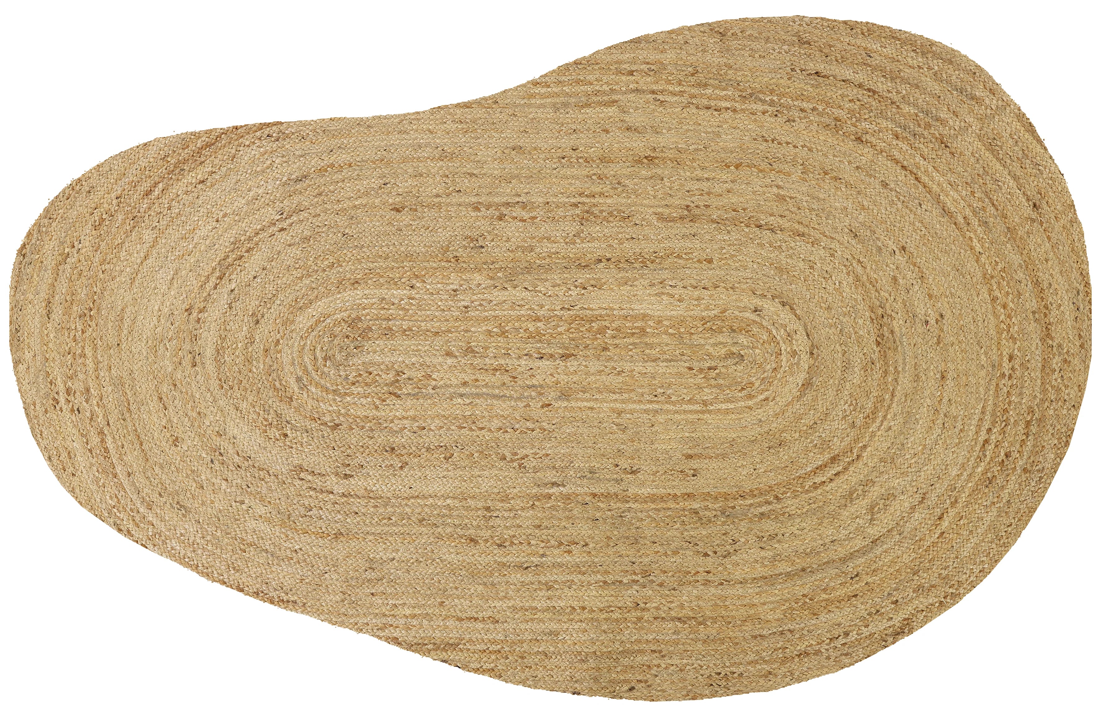 Holen Sie sich die Natur ins Haus mit diesem einzigartigen, handgewebten Teppich aus 100 % natürlicher Jute. Seine organische Form – exklusiv bei uns erhältlich – macht diesen Teppich zu einem echten Hingucker in jedem Interieur. Kein standardmäßiges rundes oder rechteckiges Design, sondern eine fließende, natürliche Form, die Eleganz und Ruhe ausstrahlt.